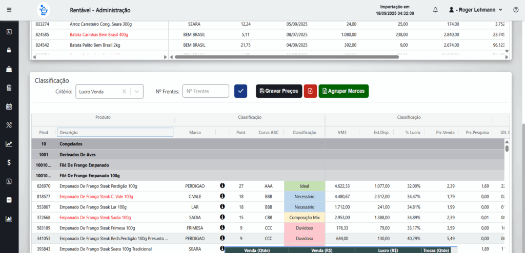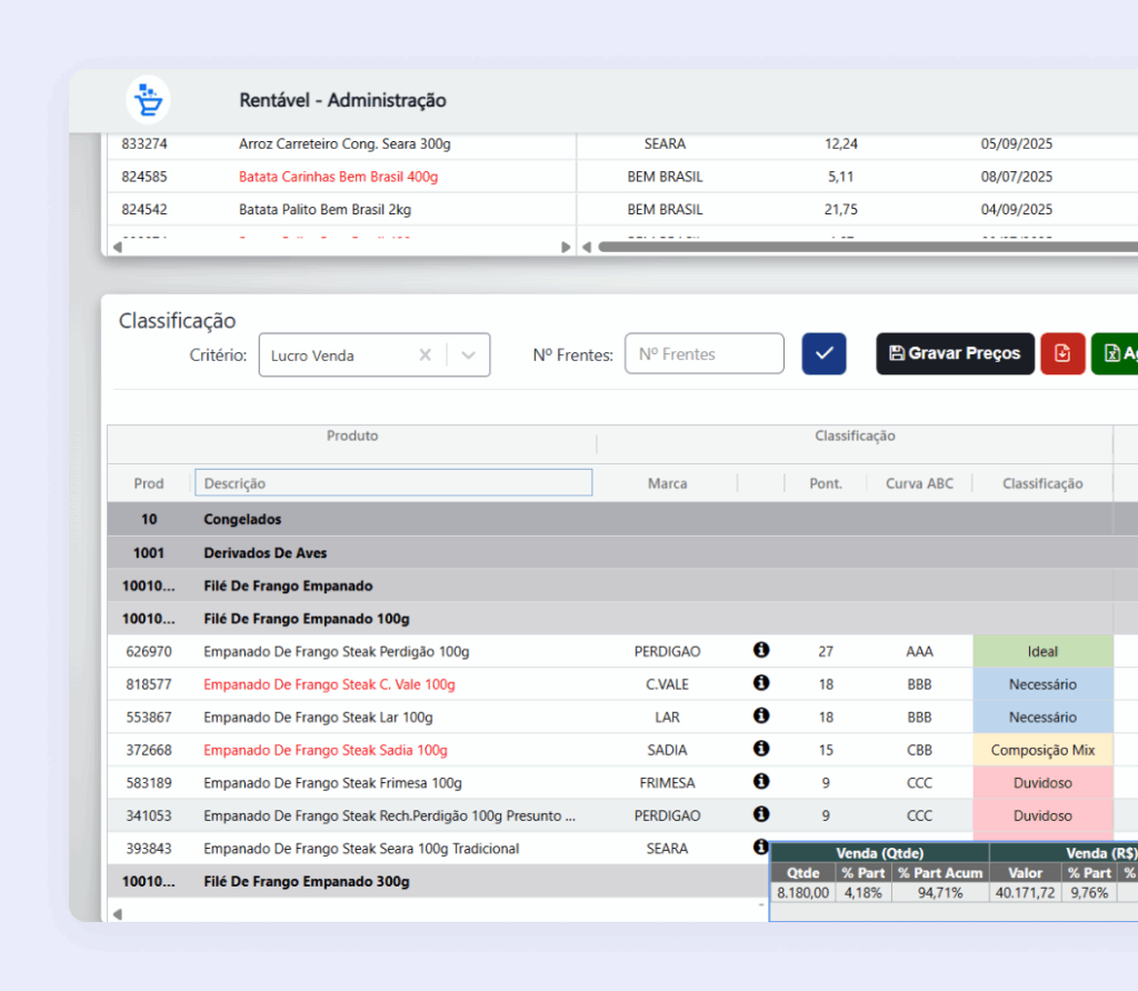 O sistema classifica produtos em categorias como ideal, necessário, composição de mix e duvidoso. Isso facilita a revisão constante do portfólio e ajuda a equilibrar faturamento, margem e giro de estoque em cada departamento.