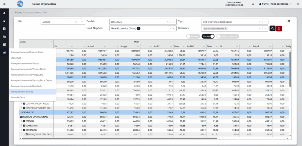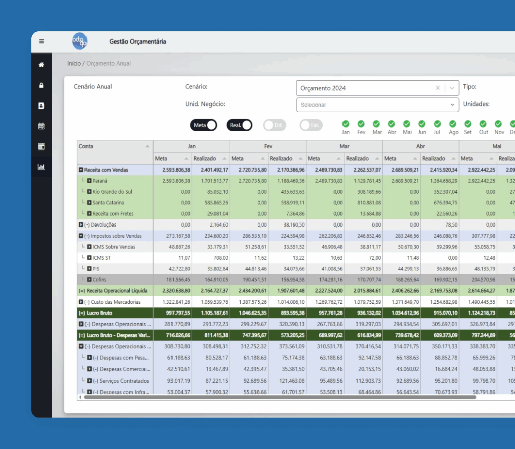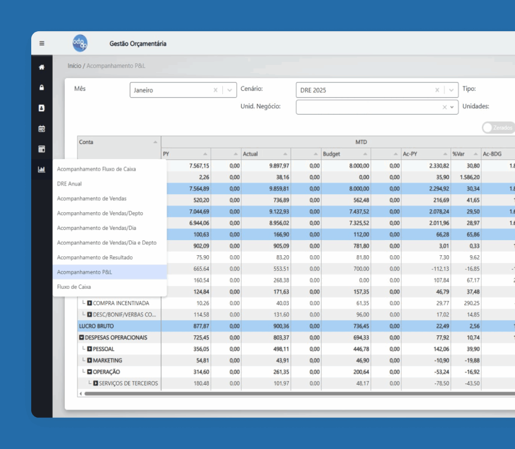 Acompanhe o desempenho financeiro mês a mês, analisando realizado, orçado e histórico em relatórios visuais que facilitam ajustes estratégicos.